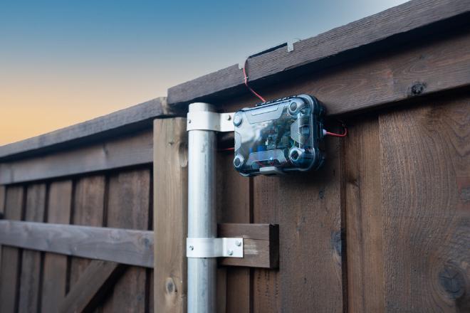 Note that in the picture above, the solar panel was installed on top of the case and its cable (red cable) was routed through the lid into the case. Although this arrangement works fine, I did not go with it in the final design because the solar panel was not getting enough light during the day. This may have been because of my fence’s particular arrangement, so it might work for other people. In the final design, I mounted the solar panel facing up, on top of the fence as seen on the image below.